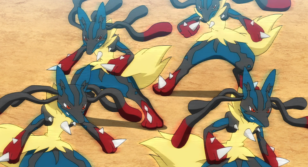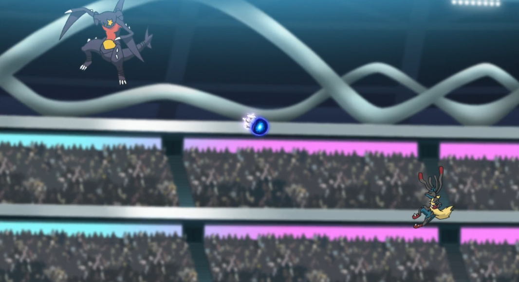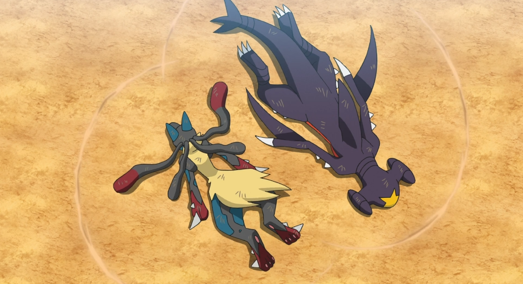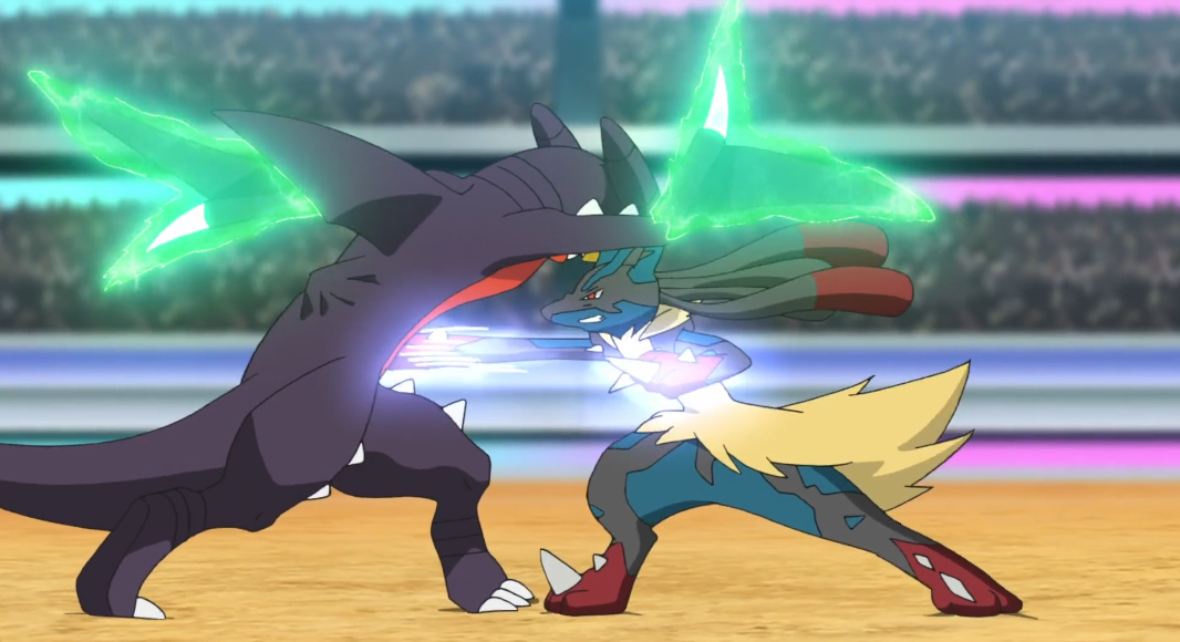 Beide Pokémon werden zurückgestoßen, setzen jedoch ohne zu zögern weitere Attacken ein: Knakrack nutzt seine Drachenklaue-Attacke, während Mega-Lucario Patronenhieb einsetzt. Sie rennen aufeinander zu und müssen beide in einem Schlagabtausch im Nahkampf einige Treffer einstecken. Doch keines der beiden Pokémon gibt nach. Nachdem zwei Hiebe von Patronenhieb und Drachenklaue sich gegenseitig aufgehoben haben, schaffen es beide gleichzeitig einen starken Treffer gegen das jeweilige andere Pokémon zu landen. Sowohl Knakrack als auch Mega-Lucario springen daraufhin zurück, um an Distanz zu gewinnen. Beide sind stark gezeichnet von dem Kampf und atmen schwer.