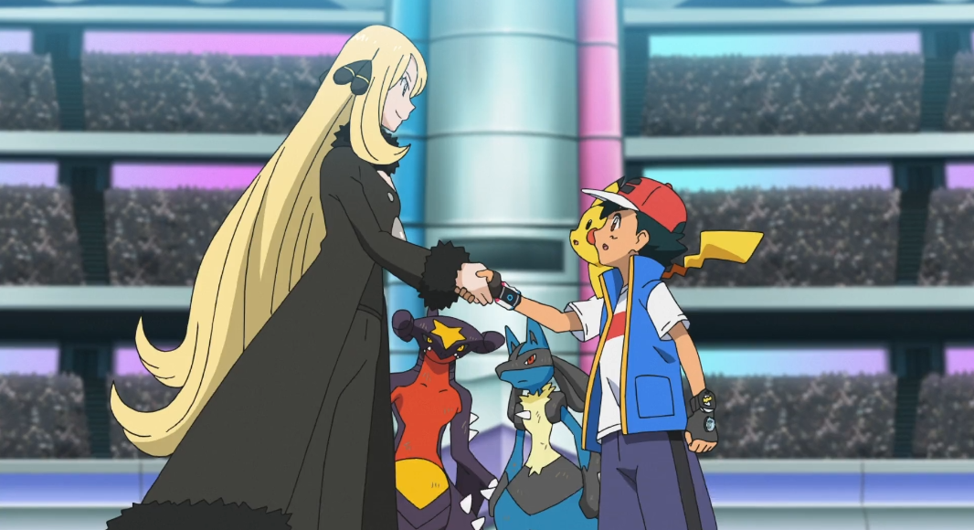 Nach dem Kampf hilft Mega-Lucario Cynthias Knakrack wieder auf die Beine, indem es ihm seine Pfote gibt und auch Cynthia und Ash geben sich die Hand, woraufhin sich letzterer für den Kampf bedankt. Doch Cynthia sagt, dass sie diejenige ist, die sich bedanken müsse, weil der Kampf mit Ash ihr gezeigt hat, dass sie noch viel lernen kann. Sie sieht sehr glücklich aus und sagt Ash, dass sie in der Zukunft noch einmal gegeneinander kämpfen sollten. Ash stimmt diesem Vorschlag zu.