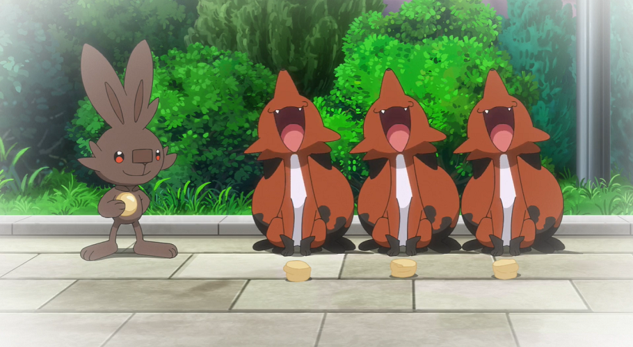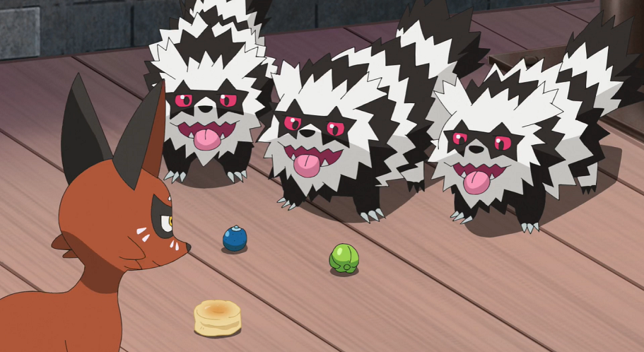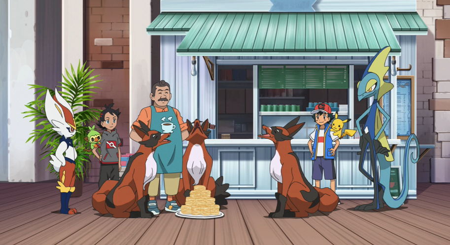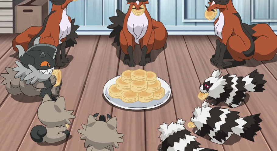 Zur Belohnung hat der Imbissbesitzer den Gaunux einen großen Teller mit Scones zubereitet. Als die Unlicht-Pokémon die Galar-Zigzachs entdecken, geben sie diesen etwas vom Essen ab. Auch Mauzinger und die beiden Galar-Mauzi bekommen Scones von den Gaunux. Da auch Ash, Goh und deren Pokémon ausreichend mit Scones versorgt werden, genießen alle gemeinsam die Köstlichkeiten.