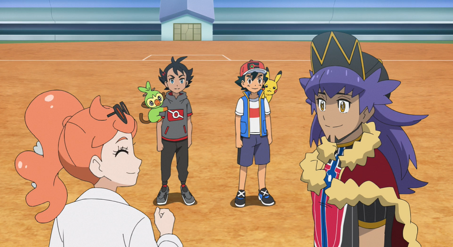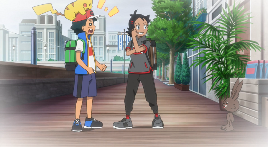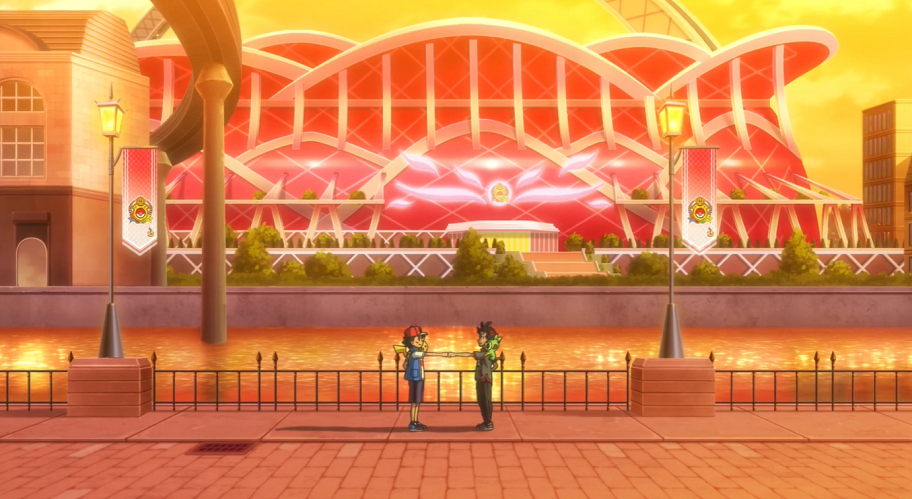 Die Sonne ist bereits am Untergehen, als Ash und Goh gesättigt am Stadion vorbeikommen. Wie Ash kann auch Goh den Kampf am nächsten Tag kaum erwarten.