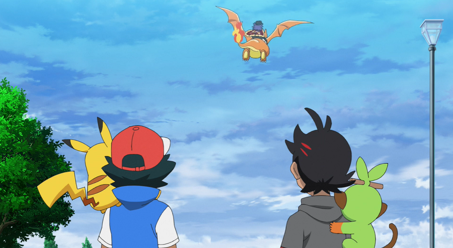 Zurück vor dem Stadion verabschieden Ash und Goh Delion, der auf seinem Glurak davonfliegt.