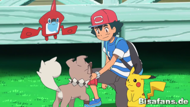 springt über den Rotomdex zum Ballon und befreit die Pokémon aus dem Netz mit einem Eisenschweif.