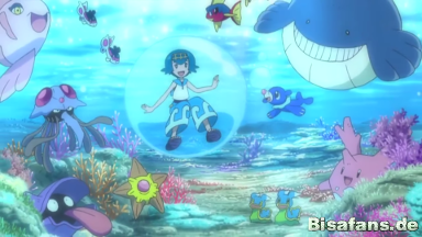 Tracy meint daraufhin, dass alle auf ihre PokéMobil-Pokémon, Lapras und Wailmer, steigen sollen und sie begeben sich