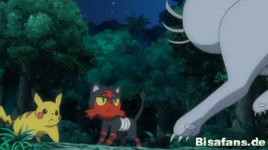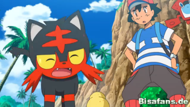 Flamiau und Alola-Snobilikat, die sich erneut ums Essen streiten. Ash greift ein, um ihm zu helfen und nimmt dabei einige