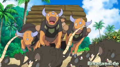 Die Pokémon flüchten über die Straße und erschrecken einen vorbeifahrenden Mann und seine Tauros, die gerade Baumstämme transportieren.