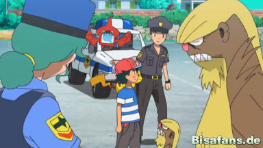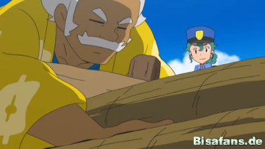 Ash und Professor Kukui kommen vorbei und sehen Officer Rocky, die versucht für Ruhe zu sorgen. Währenddessen räumen Hala und sein Hariyama die Baumstämme