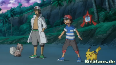 Danach fällt Ash übermüdet ins Bett und Rotom fragt ihn, warum er bisher keinen Kampf mit Kiawe ausgetragen habe. Sie bemerken durch einen Blick aus dem Fenster,