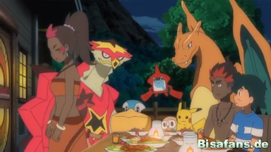 dass Kiawe draußen mit Tortunator und Glurak trainiert und gehen hinaus. Kiawe sagt, dass es sich um seine tägliche Routine nach der Arbeit handele und er