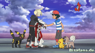 Mit Hilfe eines Z-Kristalls setzen Gladio und Wolwerock die Z-Attacke Apokalyptische Steinpresse ein und schlagen Team Rocket so in die Flucht. Kurz bevor Ash und Gladio ihren Kampf beenden können, unterbricht Lilly sie erneut und erinnert Ash daran, dass die Schule gleich beginnt. Die beiden nehmen sich vor, bald wieder gegeneinander zu kämpfen.