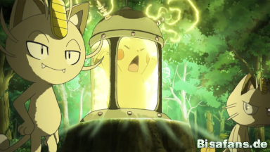 Ash und seine Freunde schaffen es, Team Rocket einzuholen und Pikachu aus seinem Gefängnis zu befreien. Mit Hilfe der Z-Attacke Gigavolt Funkelsalve schlägt Ash Team Rocket endgültig in die Flucht. Durch den starken Schlag der Attacke wird Team Rocket von dem Alola-Mauzi getrennt.