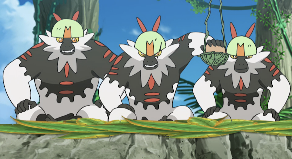 Kurz darauf kommen die Red Buns zurück und setzen sich auf den Platz des Anführers, als diese plötzlich vom Anführer der Mele-Mele Greens mit der Frucht beworfen und herausgefordert werden. Ash sichert dem Anführer seine Unterstützung an.