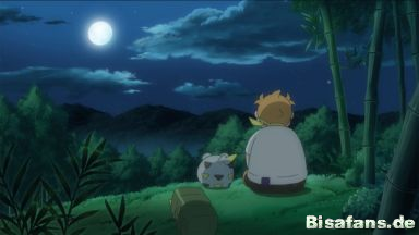 Aus einem kurzen Nickerchen wird er von Togedemaru geweckt und macht sich mit diesem und Akkup auf den Weg zu einer guten Aussichtsstelle, um sich dort den Mond ansehen zu können. Daraufhin beginnt er, seinen Pokémon das Bambus-Märchen zu erzählen: In diesem war ein hellgrüner Stern auf der Erde in einem Bambuswald gelandet. Ein älteres Ehepaar, das dies beobachtet hat, hätte daraufhin einen grün-leuchtenden Bambussprössling mit niedlichem Gesicht entdeckt. Sie hätten sich in der Folge um den Sprössling, der immer größer wurde gekümmert - allerdings auf Kosten des Waldes um ihn herum, was den Bewohnern des angrenzenden Dorfes nicht gefallen hätte. Als sie den Sprössling beseitigen wollten, sei dieser in den Himmel abgehoben, um Richtung Mond zurückzukehren, und hätte dabei die Form eines Sternenschiffs gehabt. Nach diesen Geschehnissen sind zur Freude der Dorfbewohner in dem Wald sehr viele Bambussprösslinge gewachsen.