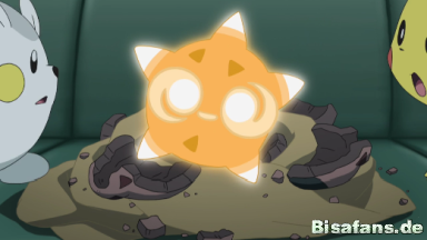 Venicro entdeckt ein weiteres Meteno auf dem Boden, das sich noch nicht von seiner Schale befreien konnte. Ash will dem