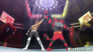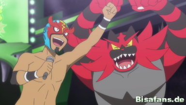 Nachdem Fabian bereits nach einem Schlag besiegt wurde, schafft es Kukui mit der Hilfe von Marlon, der sich inzwischen selbst befreien konnte, die Maske aufzusetzen und in sein Outfit zu schlüpfen, um seinen Rivalen besiegen zu können und ihn in die Flucht zu schlagen. Seine Fans feiern den Sieg von Mask Royale und das Meet and Greet kann in Ruhe beendet werden. Keiner hat bemerkt, dass Professor Kukui Mask Royale ist. Gemeinsam gehen Ash, Burnette und Kukui nach Hause, um den ereignisreichen Tag zu Ende gehen zu lassen.