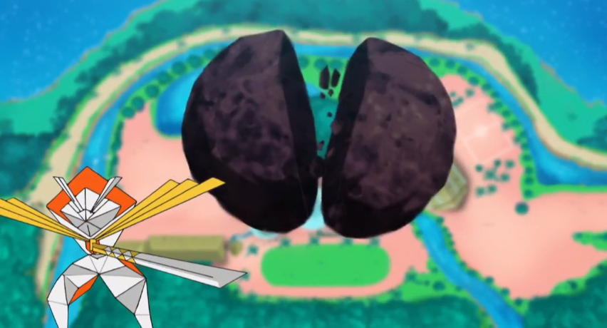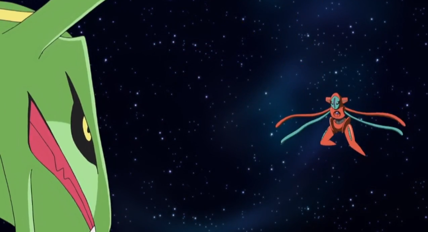 Unterdessen bekämpfen sich Deoxys und Rayquaza im Weltraum, wobei diese durch ihre Attacken einen Meteoroiden in Richtung Erde befördern.