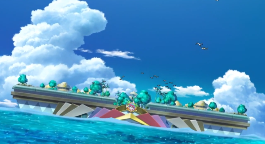 Ash und die anderen Schüler erreichen mit dem Schiff die von der Aether-Foundation errichtete künstliche Insel,