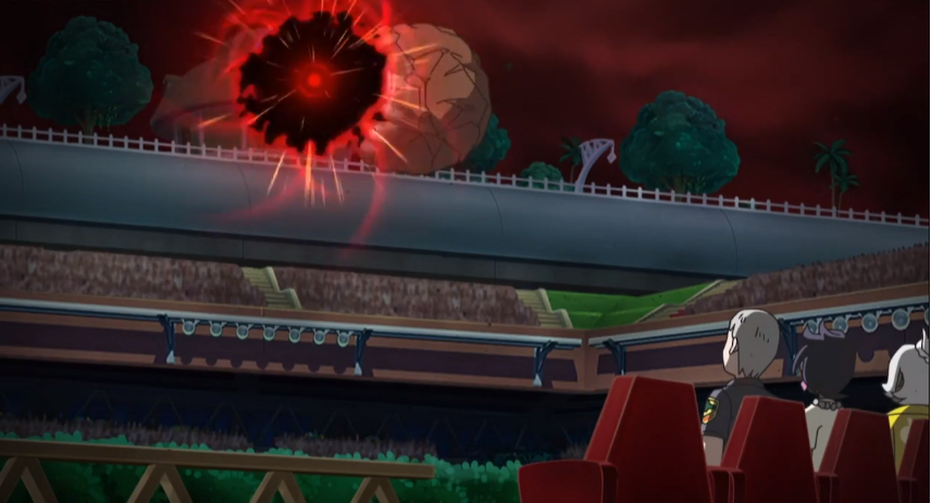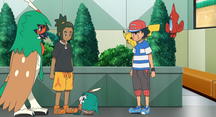 Während sich die Schüler als Zuschauer über Gladios Sieg freuen, dabei aber schon auf Ash warten, dessen Kampf als nächstes folgen soll,