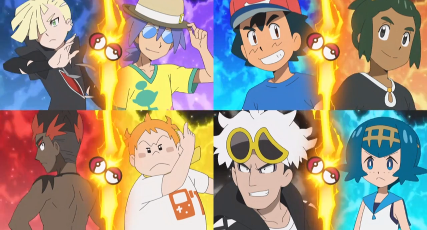 Ash, Chrys, Fabian, Gladio, Hala, Hapu'u, James, Jessie, Kiawe, Lilly, Maho, Mayla, Pia, Professor Burnett, Professor Kukui, Tali, Tracy, Turniersprecher, Yasu, Zuschauer