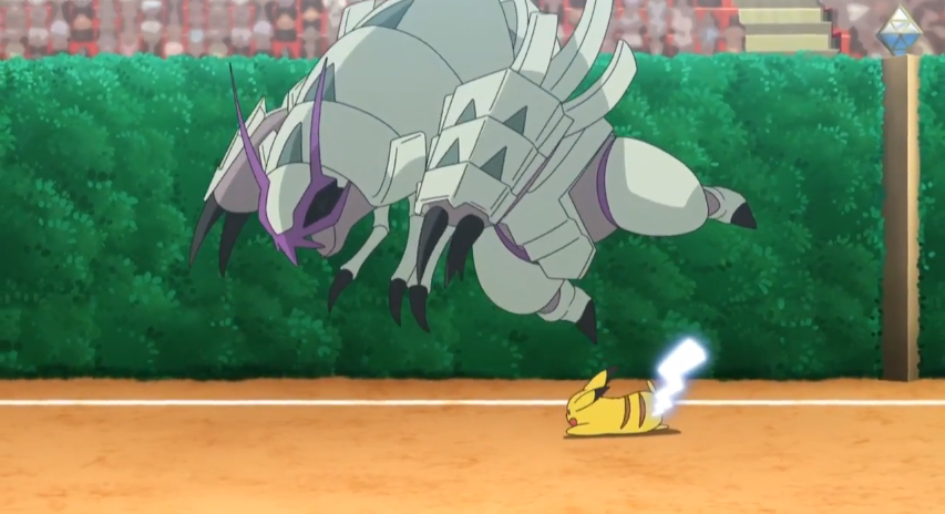 kann Bromleys Pokémon trotz seiner Effektivität problemlos mit dessen Schild abwehren. Doch Ash hatte schon damit gerechnet und Pikachu