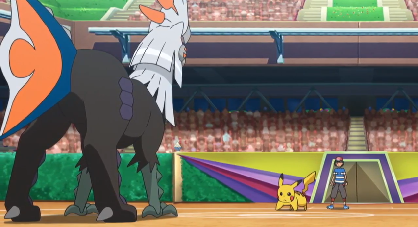 Gladio schickt als erstes Pokémon Amigento in den Kampf. Ashs erstes Pokémon ist, zur Überraschung Gladios,