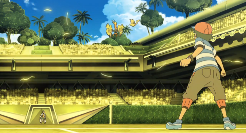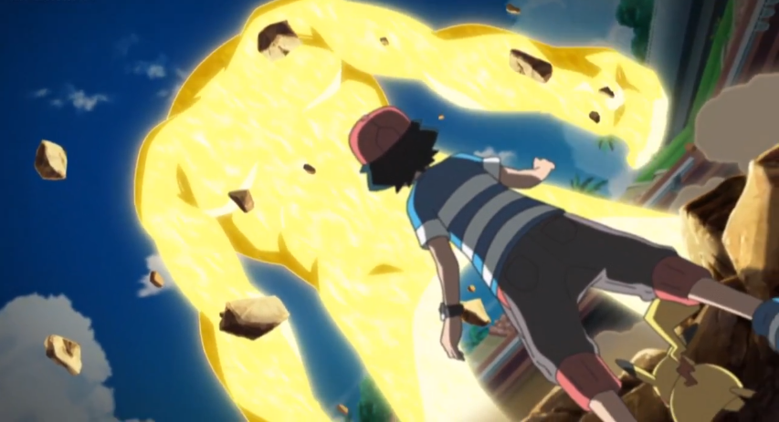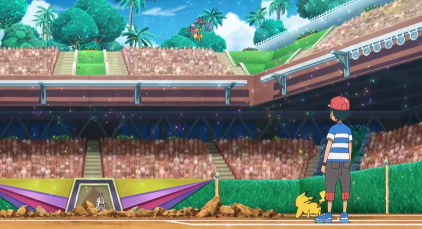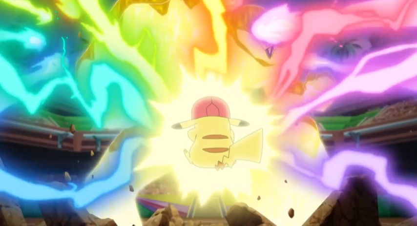 Kukui und Kapu-Riki beginnen mit dem Einsatz ihrer Z-Attacke Alolas Wächter. Durch diese öffnet sich die Erde und ein gewaltiger, gelb strahlender Erdtitan baut sich vor Ash und Pikachu auf, auf dessen Körper sich Kapu-Riki als Kopf platziert. Ash ist von diesem Schauspiel genauso beeindruckt wie seine Freunde und die anderen Zuschauer im Stadion. Gemeinsam feuern die anderen Schüler Ash an, der anschließend durch das Aufleuchten seines Z-Rings registriert, dass sein Z-Kristall sich von einem Voltium Z- in einen Ash-Pikachium Z-Kristall verwandelt hat. Gemeinsam machen sich Ash und Pikachu daran, die Z-Attacke Tausendfacher Donnerblitz auszuführen und dem gewaltigen Faustschlag des Erdtitanen entgegenzusetzen. Ash und Pikachu geben alles und plötzlich spüren sie eine ganz besondere Aura, die Ash als Kraft von Alola bezeichnet. Sie erinnern sich an viele Momente, die sie gemeinsam mit ihren Freunden in der Alola-Region erlebt haben, was ihnen weitere Kraft verleiht und es ihnen so ermöglicht, Kapu-Riki zu besiegen.