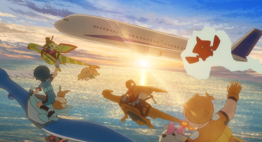 Freunde, die auf den Ultra-Wächter-Pokémon neben dem Flugzeug fliegen und sich von ihm