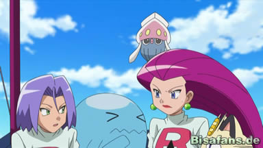 Derweil sitzt ein gewisses diebisches Trio in einem Café Illumina Citys und unterrichtet Giovanni über ihre Ankunft in Kalos und ihre zukünftigen Pläne. Nachdem sie die Verbindung beendet haben, freuen sich die drei erst einmal über einen neuen Plan und ein neues Abenteuer und ziehen dabei einige Aufmerksamkeit auf sich. Dabei wird James' Croissant allerdings von einem langen Arm gestohlen.