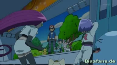 Das tun sie natürlich und die Bälle, die eigentlich Rauchbomben waren, gehen in die Luft. Ash und seine Freunde evakuieren die Kinder, doch gerade als auch das letzte von der Bühne gestiegen ist, fängt ein Energienetz Pikachu und Feelinara, die genau wie Ash, noch oben stehen. Ash wird zurückgeschleudert, der Lastwagen schließt sich und fährt von dannen.