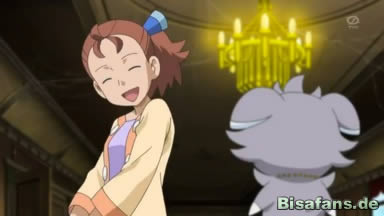 Schließlich erklärt sie, dass beschlossen war, die Villa abzureißen, doch nun, da sie die Freunde und Pokémon hier getroffen hat, beschließt sie, die Villa stattdessen zur renovieren und in ihr zu wohnen, natürlich nicht, ohne ein Bild ihrer Großmutter aufzuhängen. Dann schlägt sie Psiau vor, mit ihr das Grab der alten Frau zu besuchen.