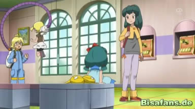 Lyn sucht inzwischen nach dem Pokémon-Center, als Dedenne wieder verschwunden ist. Sie kann es aber dank der Schleife schnell in einem Schaufenster mit Pokémon-Puppen finden.