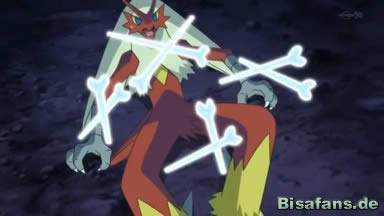 Lucario setzt Power-Punch ein und kann ein paar Treffer landen, bevor es Knochenhatz einsetzt und so Lohgock am Boden festnagelt. Ein letztes Mal will Lucario Power-Punch einsetzen, um Lohgock zu besiegen, doch ruft plötzlich jemand aus den Schatten der Höhle, dass es reicht. Lucario und Connie sind verwirrt.