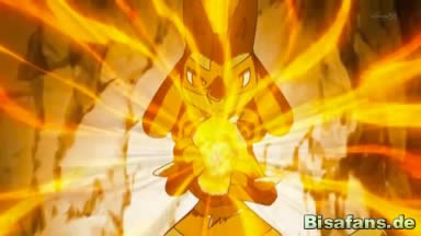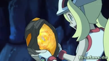 Dann ist der große Moment gekommen und Connie soll zum ersten Mal den Lucarionit verwenden. Tatsächlich wird die Mega-Entwicklung Lucarios eingeleitet und Lucario beginnt langsam, sich zu verändern.