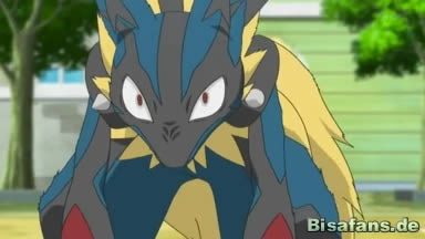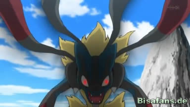 Schließlich wird Pikachu von Power-Punch getroffen und gegen einen Stein geschleudert. Es kann aber mit Elektroball angreifen, doch Mega-Lucario greift an und setzt Power-Punch ein. Nun bemerken die Trainer, dass etwas mit Mega-Lucario nicht stimmt, als es Pikachus Schweif mit den Zähnen packt und umherwirbelt. Anschließend kicket es Pikachu mit einem Tritt weg und Ash läuft zu Pikachu.