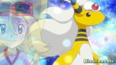 Ash befiehlt Pikachu Elektroball, doch wird der Angriff zurückgeworfen. Alle überlegen, was sie tun sollen, und Lucario will eine Mega-Entwicklung durchführen. Connie zögert, doch kann sich schließlich aufgrund der Hoffnungslosigkeit der Lage überzeugen lassen.