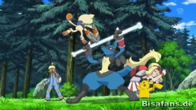 Gerade will Mauzi Connie mit Kratzfurie angreifen, als Lucario sie mithilfe von Knochenhatz schützt.