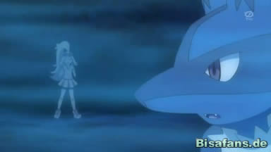 Mega-Lucario kann Iscalar mit Knochenhatz treffen, dann aber verliert es die Kontrolle und greift die Freunde an. Team Rocket gefällt das und beobachtet die Situation, als Mega-Lucario auf Connie zuläuft. Da aber erinnert es sich an die vergangene Nacht und bricht den Angriff noch rechtzeitig ab.