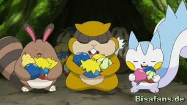 Die vier Freunde gehen zurück und sehen, dass die kleinen Pokémon, die sie gesehen haben, nun verschreckt auf einem Baum sitzen. Ihre Beeren werden gerade von einem Ursaring gestohlen.