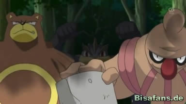 Inzwischen haben die Pokémon des Waldes ihre Beeren wieder eingesammelt und das Ursaring kommt auf Resladero mit einem Felsen zwischen den Klauen, den er auf Resladero werfen will, zu. Ash beschließt, einzugreifen und versucht, Ursaring davon abzuhalten. Als Worte nichts bringen, lässt er Pikachu Eisenschweif einsetzen, was den Felsen zerstört und Ursaring am Kopf trifft. Das Pokémon flieht darauf.