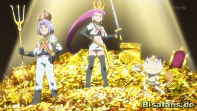 Die Pokémon der Freunde stellen sich vor Jessie auf. Diese betrachtet sie und beginnt bei Kussilla zu schwärmen. James meint, dass sie beginnen sollte und Jessie beginnt den Freunden etwas zu erzählen. Kurz darauf meint sie zu James, sie solle ihm den Koffer geben. In diesem bläst sich ein großer Luftballon auf, und Jessie meint, die Pokémon würden darin tanzen. Dieser Ballon entpuppt sich als Falle um die Pokémon zu fangen und Team Rocket enttarnt sich. Es verschwindet mit den Pokémon, aber Jessie lässt es sich nicht nehmen, zu meinen, dass sie die Kalos Queen wird. Der Ballon von Team Rocket fliegt weg, auch wenn die Freunde versuchen, ihn zu verfolgen. Plötzlich wirft Mauzi eine merkwürdige Kapsel zu Boden, aus der erst nichts zu kommen scheint, dann aber die Freunde in Nebel hüllt. Ash ruft sein Dartignis, damit es Team Rocket verfolgt und die Freunde laufen ebenfalls los.