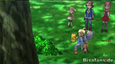 Nun tauchen auch seine Freunde auf, jedoch scheint Jessie nicht wirklich begeistert zu sein. Sie wirft einen Würfel auf die Freunde, welcher Serena, Heureka und Citro an einander fesselt. Mauzi versucht, erneut Pikachu zu fangen, jedoch kann dieses sich mit Eisenschweif verteidigen. Ashs Pokémon kämpfen nun gegen die von Team Rocket.