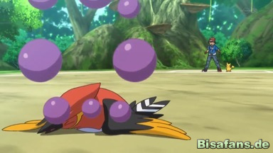 Schließlich kann der Arenakampf, bei dem Viscora zuschauen darf, beginnen. Es sollen drei Pokémon eingesetzt werden, und Amaro startet mit Papungha, während sich Ash auf Dartignis verlässt.