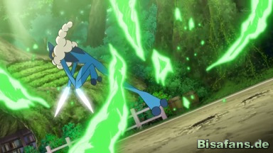 Anschließend greift Ultrigaria mit Rasierblatt an, doch Amphizel wehrt mit Aquawelle aus. Auch einem folgenden Giftpuder kann Amphizel entgehen, indem es sich eine Maske aus dem klebrigen Mousse um seinen Hals macht.