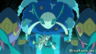 Diese sind inzwischen bei der Höhle – der Quelle des Wassers im Sumpf – angekommen und werden dabei von Florges' Armee in Empfang genommen. Obwohl sie versuchen, mit den Pokémon zu reden und diesen zu erklären, dass Team Rocket böse sind, werden sie angegriffen. Daher rufen Serena und Citro ihre Pokémon, während Ash, Viscogon und Heureka in die Höhle gehen.