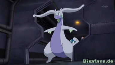Auch Viscogon will nicht untätig sein und katapultiert sich mithilfe von Drachenpuls nach oben und landet bei Ash und Florges.
