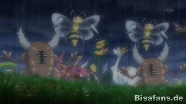 Auch Kenne und Citro kommen dazu und erfahren, was gerade passiert ist, während Ash seine Pokémon ruft, um gegen die Käfer-Pokémon anzukämpfen. Es scheint aber aussichtslos, weshalb Viscogon ihm helfen will und aufsteht. Gestützt von Kenne und Serena kann es das Haus verlassen, wo sich Ash um Amphizel und Dartignis kümmert, während die Käfer-Pokémon mit den Pokémon der Freunde wegrennen.