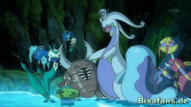 Plötzlich aber beginnt die Erde zu beben und das Wasser verschwindet auf einmal komplett. Dies bekommen auch die anderen draußen mit, und Team Rocket betritt die Höhle. Auch die entführten Pokémon hat es dabei und nun, direkt Ash und Heureka gegenüber, bleibt dem Trio nichts anderes übrig, als seine üblen Pläne zuzugeben.