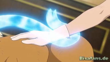 leuchtendes Band zu Serena Arm. Evolis ganzer Körper beginnt zu leuchten. Es entwickelt sich. Evoli hat sich zu Feelinara