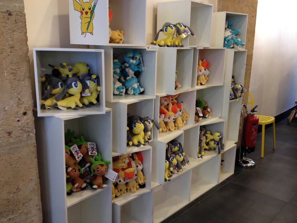 Besonders zu Beginn war Besuchern ein breites Plüschfiguren-Sortiment geboten, das sich aus Pokémon wie Igamaro, Fynx, Froxy, Dartiri, Dedenne, Pikachu, Iscalar, Eguana, Feelinara, Igastarnish, Amphizel, Rutena, Xerneas und Yveltal zusammensetzte. Natürlich gab es auch Figuren, Sammelkarten, T-Shirts, Tassen, Poster, Postkarten und Mangas zu erwerben. Wer sich nach den Einkäufen ein wenig ausruhen wollte, der konnte im hinteren Bereich des Geschäfts eine riesige Leinwand mit den Artworks aller damals existierenden Pokémon bewundern. Auch bezaubernde Artworks verschiedener Orte und Städte aus den Pokémon-Regionen waren an den Wänden aufgehängt.
