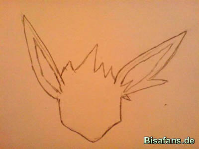 Zuerst zeichnet ihr den Kopf. Die Grundform dazu ist ein Dreieck (das Kinn) und ein Viereck mit zwei Ohren (Kopf).