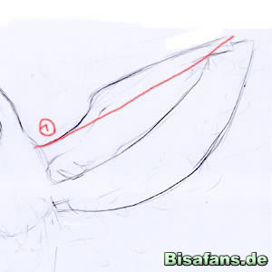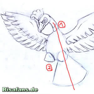 Am besten ihr skizziert euch erstmal die gedachten Relationen vor. Hier kann man sich einfach vorstellen, dass Ho-Oh 2 Flügel hat, einmal die kleinen “Stummelflügel” (siehe 1) und zum Anderen die “Erweiterung” (siehe 2), welche unter den anderen Flügeln liegt. Hier steht euch wieder völlig frei, was für eine Spannweite Ho-Oh’s Flügel haben, ihr dürft also entscheiden wie kurz oder lang sie sind. Hier könnt ihr eine leichte Kurve nach oben machen, welche anschließend wieder leicht nach rechts geht. Das sollen Ho-Oh Gelenke darstellen, nur leider wird Ho-Oh oft mit (meiner Meinung nach) recht mickrigen Gelenken gezeichnet - mehr dazu weiter unten.Die obere Linie wird die untere Grenze des einen Flügels und die untere Linie gehört zum anderen Flügel, am Ende sollen beide Linien bogenförmig mit der Obersten zusammenlaufen. Das hört sich jetzt vielleicht kompliziert an, orientiert euch einfach am Bild.